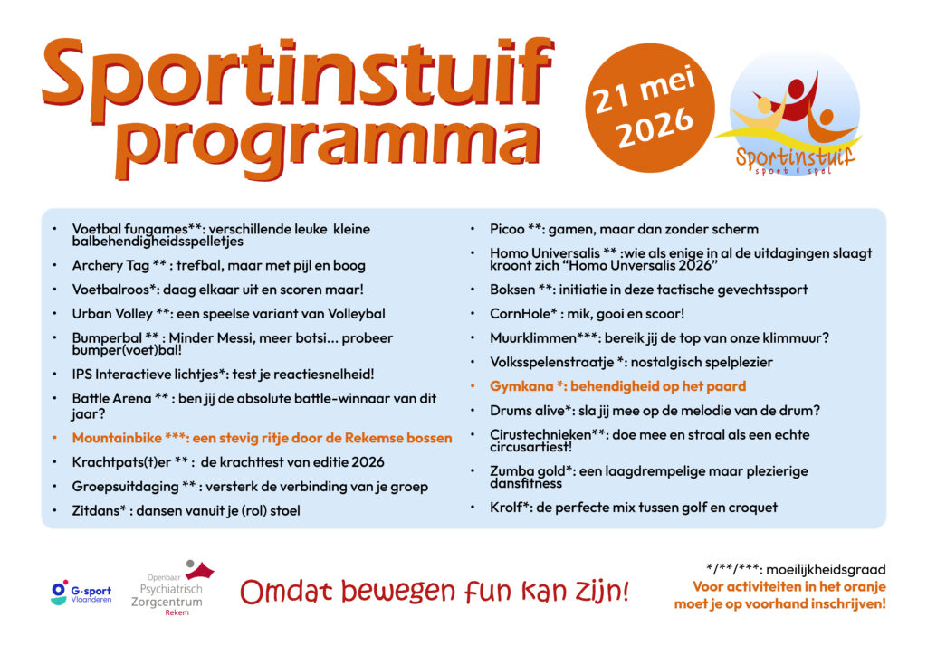 Wist je dat bewegen ook fun kan zijn? Ontdek het tijdens onze Sportinstuif! Een toffe sportdag met een gevarieerd programma vol leuke spel– en bewegingsactiviteiten voor mensen met een psychische kwetsbaarheid.